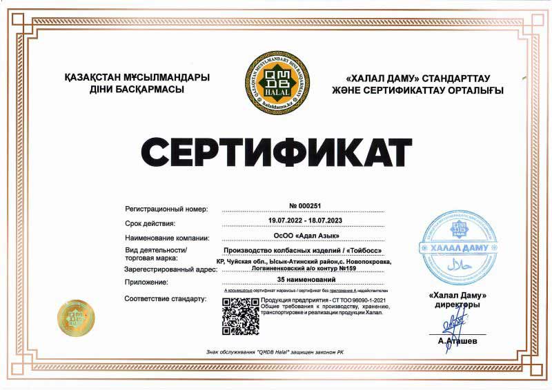 2017-жылы компания Кыргыз Республикасынын мыйзамдарына жана Бажы союзунун техникалык регламенттерине ылайык, тамак-аш коопсуздугунун менеджмент системасынын жана ХАССП системасынын принциптерине ылайык иш алып барган ишкана катары таануу боюнча аудиттен өткөн, ошондой эле ISO 22000:2005, ISO/TS 22002-1:2009 жана FSSC 22000 талаптарына ылайык TÜV Thüringen e.V эл аралык уюму тарабынан тастыкталган. Өндүрүш да адал принциптерине ылайык жүргүзүлөт жана Кыргыз Республикасынын КМДБсы жана Кыргыз Республикасынын Мамлекеттик стандарттары тарабынан тастыкталган.