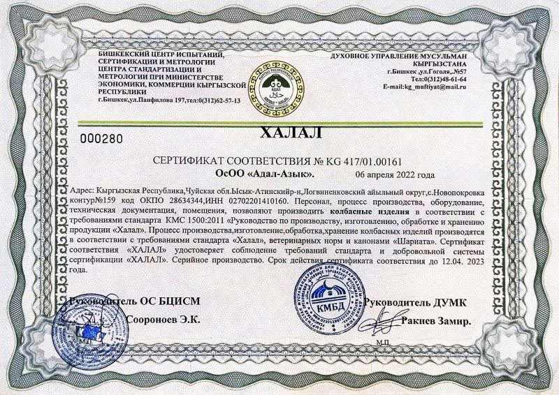 2017-жылы компания Кыргыз Республикасынын мыйзамдарына жана Бажы союзунун техникалык регламенттерине ылайык, тамак-аш коопсуздугунун менеджмент системасынын жана ХАССП системасынын принциптерине ылайык иш алып барган ишкана катары таануу боюнча аудиттен өткөн, ошондой эле ISO 22000:2005, ISO/TS 22002-1:2009 жана FSSC 22000 талаптарына ылайык TÜV Thüringen e.V эл аралык уюму тарабынан тастыкталган. Өндүрүш да адал принциптерине ылайык жүргүзүлөт жана Кыргыз Республикасынын КМДБсы жана Кыргыз Республикасынын Мамлекеттик стандарттары тарабынан тастыкталган.